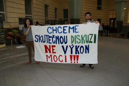Tak tedy, heslo ve skutečnosti znělo: "Chceme skutečnou diskuzi, ne výkon moci" (a omlouvám se za nepřesnost). Jeho poselství bylo zřejmé. I mně, jasně. Studenti – nejen od nás z fakulty – byli nespokojení s tím, jak tehdy Ministerstvo školství zohledňovalo námitky akademické obce vůči chystaným reformám. Úředníci se tvářili, že o diskusi stojí. Dokonce prý tehdy chtěli uspořádat nějaký „kulatý stůl“. Jenže, jak už to bývá, bylo to jen naoko. Diskuse byla podle studentů pouze kašírovaná, ne opravdová, hodná toho jména. Snad prý nad sociologickým smyslem onoho transparentu tehdy někteří studenti i zapochybovali, ale nakonec v té různorodé skupině převládlo mínění, že to „vzhledem k ‚mediálnímu a politickému provozu‘ bude vhodné heslo“. Teorii je prý zkrátka vhodné nějak zjednodušit a vyostřit, jinak bychom nejspíš zůstali „paralyzovaní a neschopní vlastně [něco] říct“.